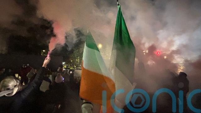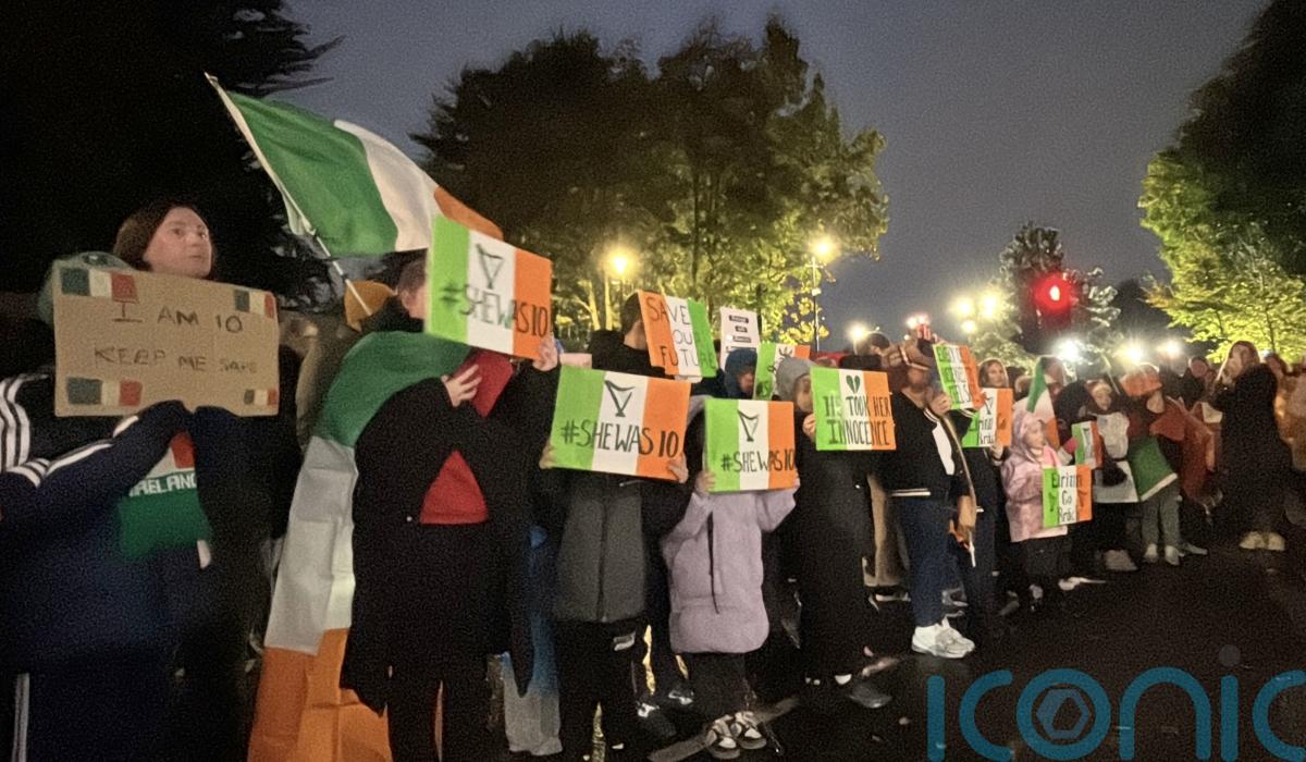 People gathered at Citywest Hotel in Saggart holding banners in the colours of the Irish flag which read “she was 10”, and let off pink smoke.