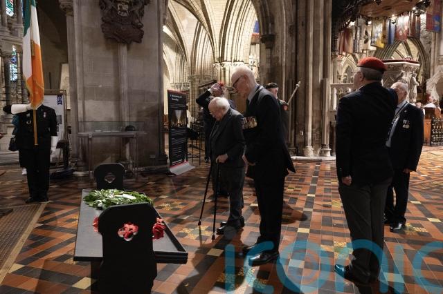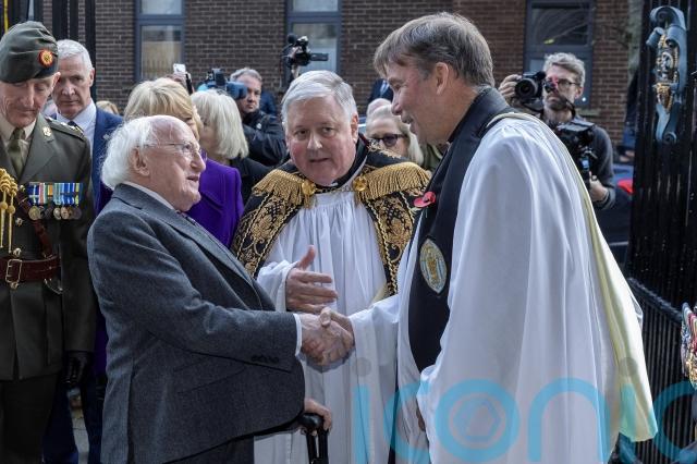 In Dublin, outgoing Irish President Michael D Higgins marked his penultimate day in office by laying a wreath at a remembrance service at St Patrick’s Cathedral.