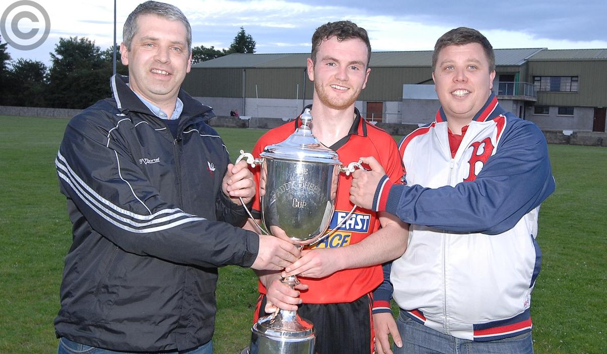 Mattock captain Michael McKeown being presented with the Paddy Sheelan Cup by Des Halpenny (Louth County Board chairman) and Darren McCann (Sheelan family) Pic: Arthur Kinahan.