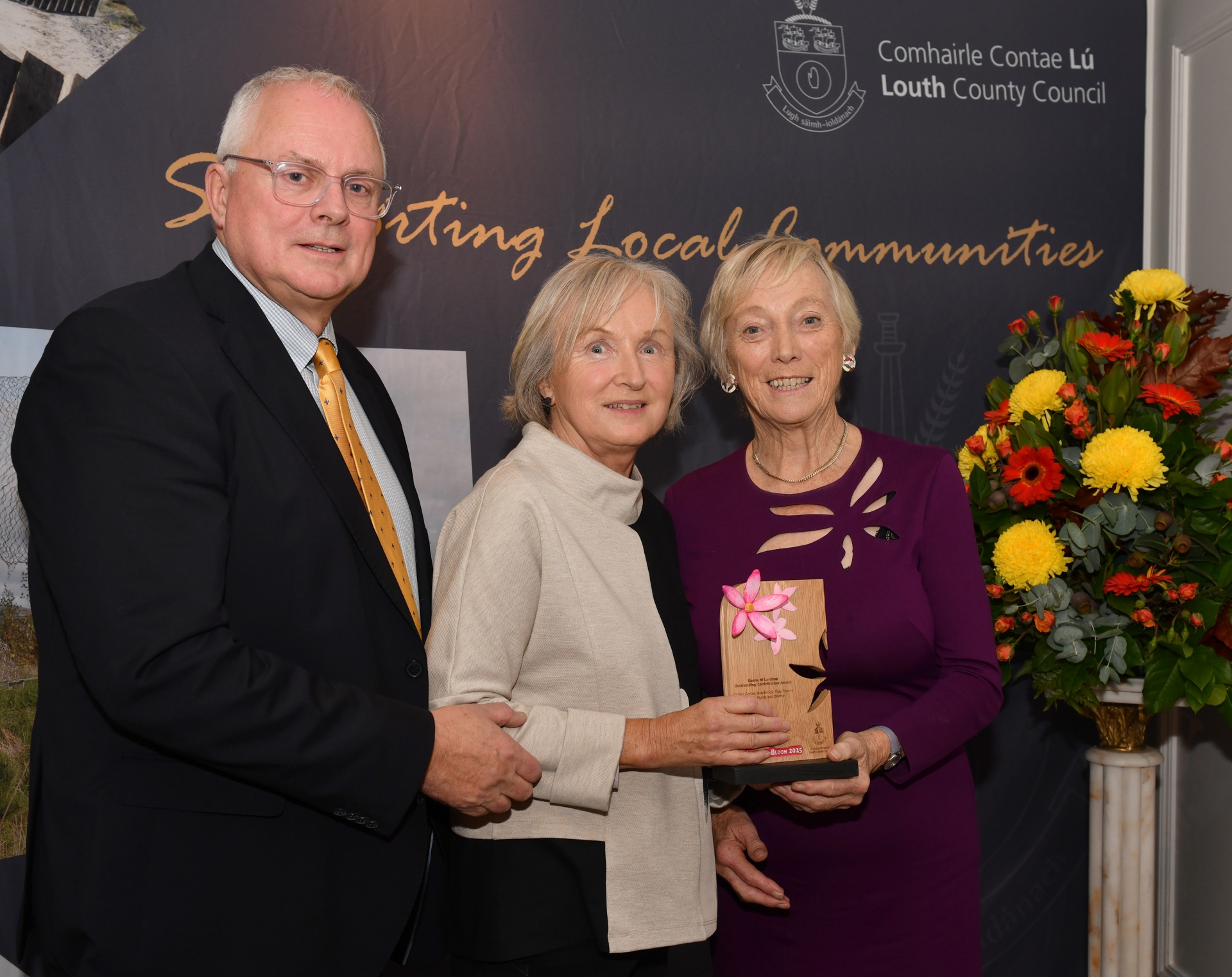 Eileen Carter, Blackrock Tidy Towns receives the Eanna Ní Lamhna award for Outstanding Contribution from Eanna and David Conway, Chief Executive LCC at the Louth in Bloom awards ceremony held in Bellingham Castle. Photo by Ken Finegan/Newspics Photography