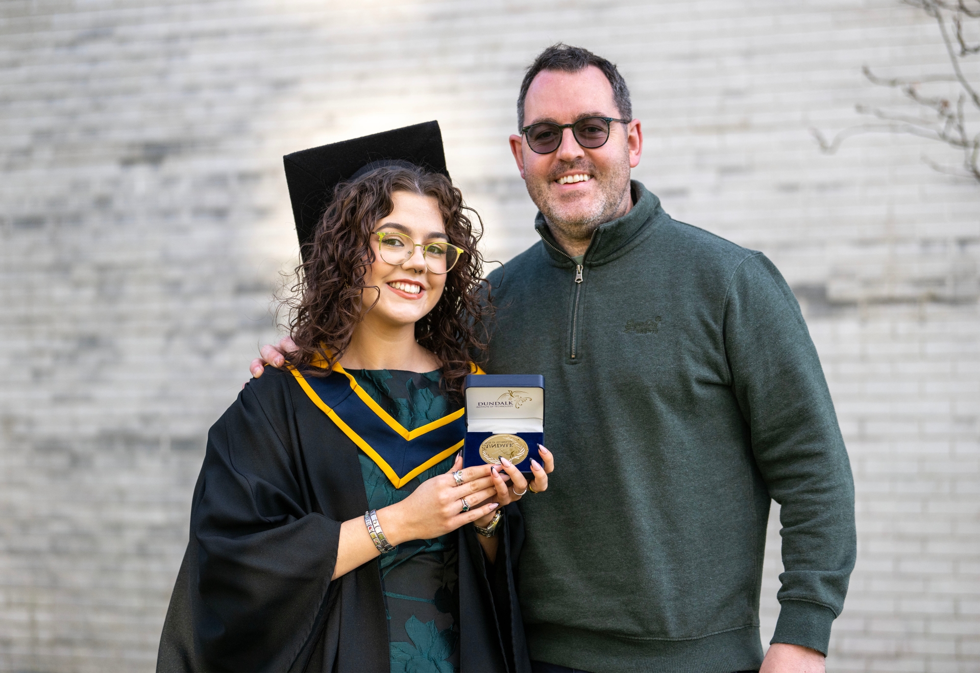 Naoise Gray from Dundalk, who was awarded the President’s Prize for the Bachelor of Science in Pharmaceutical Science with her dad Sean Duff