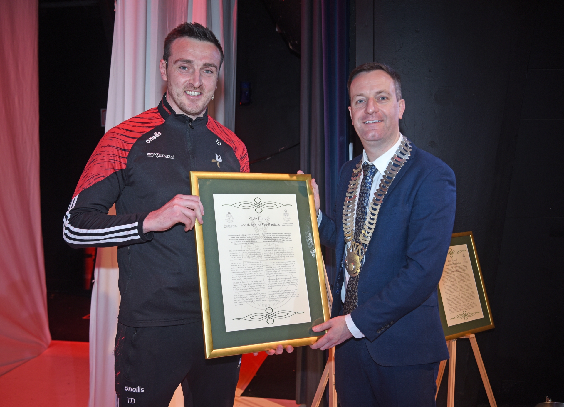 Tommy Durnin, vice-captain of the 2025 Leinster GAA Senior Football Championship winning Louth team is presented with the Civic Honour Scroll by Cllr Seán Kelly, Cathaoirleach of Louth County Council.