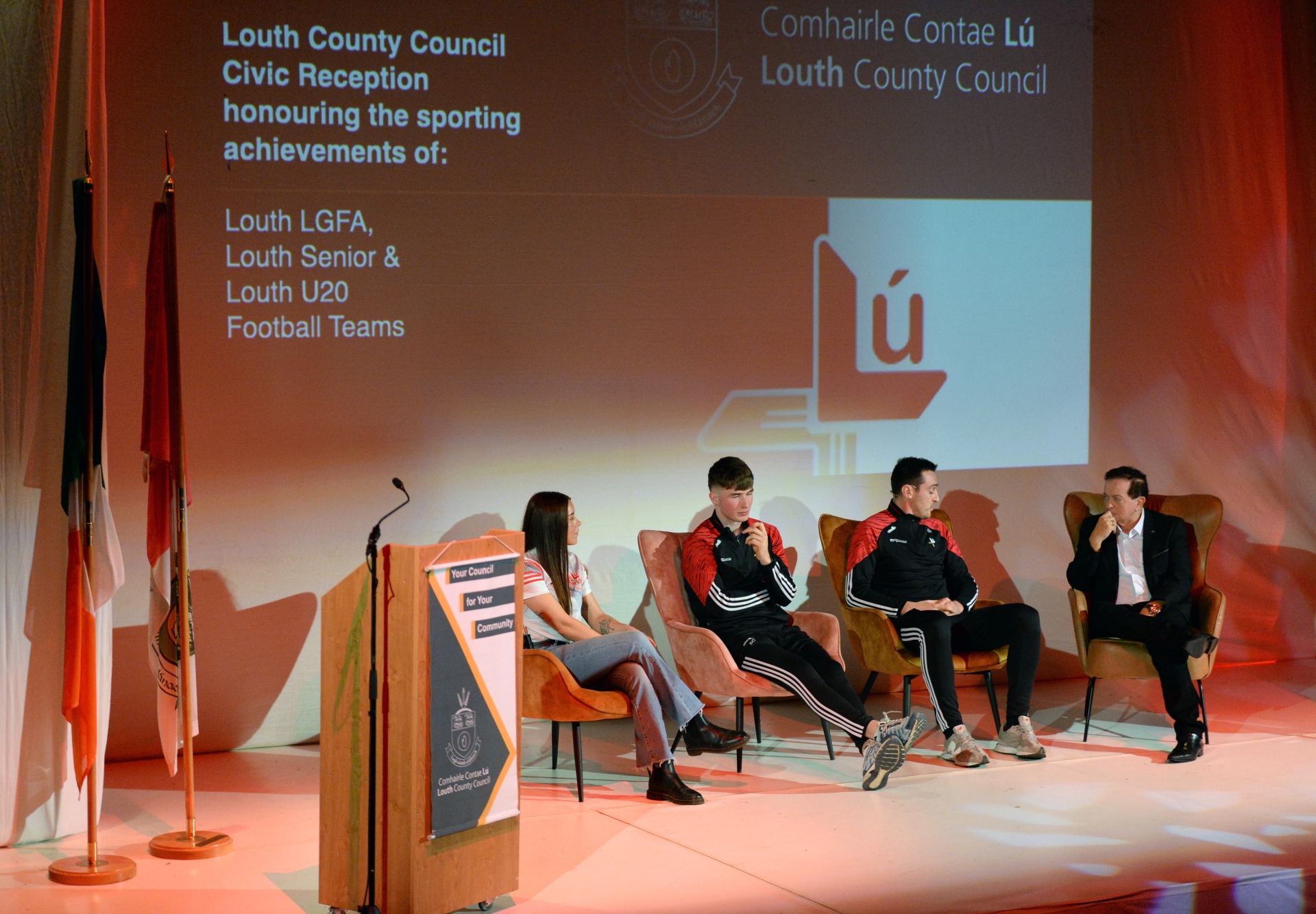Captains Áine Breen, Sean Callaghan and Tommy Durnin join sports commentator and television presenter Marty Morrissey for a panel discussion at a Civic Reception honouring the sporting achievements of the three county teams during the 2025 Gaelic football season.