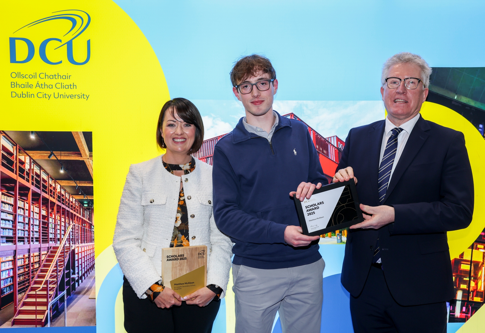 Matthew McAloon with Jennifer Kelly, Deputy Principal of St. Joseph's Secondary School, Drogheda with DCU President, Professor Dáire Keogh. Matthew McAloon is studying for a Bachelor of Science in Actuarial Mathematics at Dublin City University. Pic: Kyran O’Brien/DCU