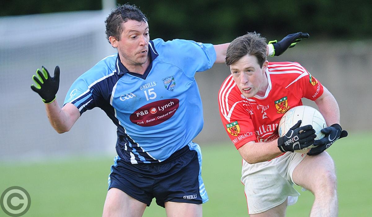Naomh Malachi corner-back David Begley is tackled by Glyde's Gavin Duffy (Pic: Arthur Kinahan)