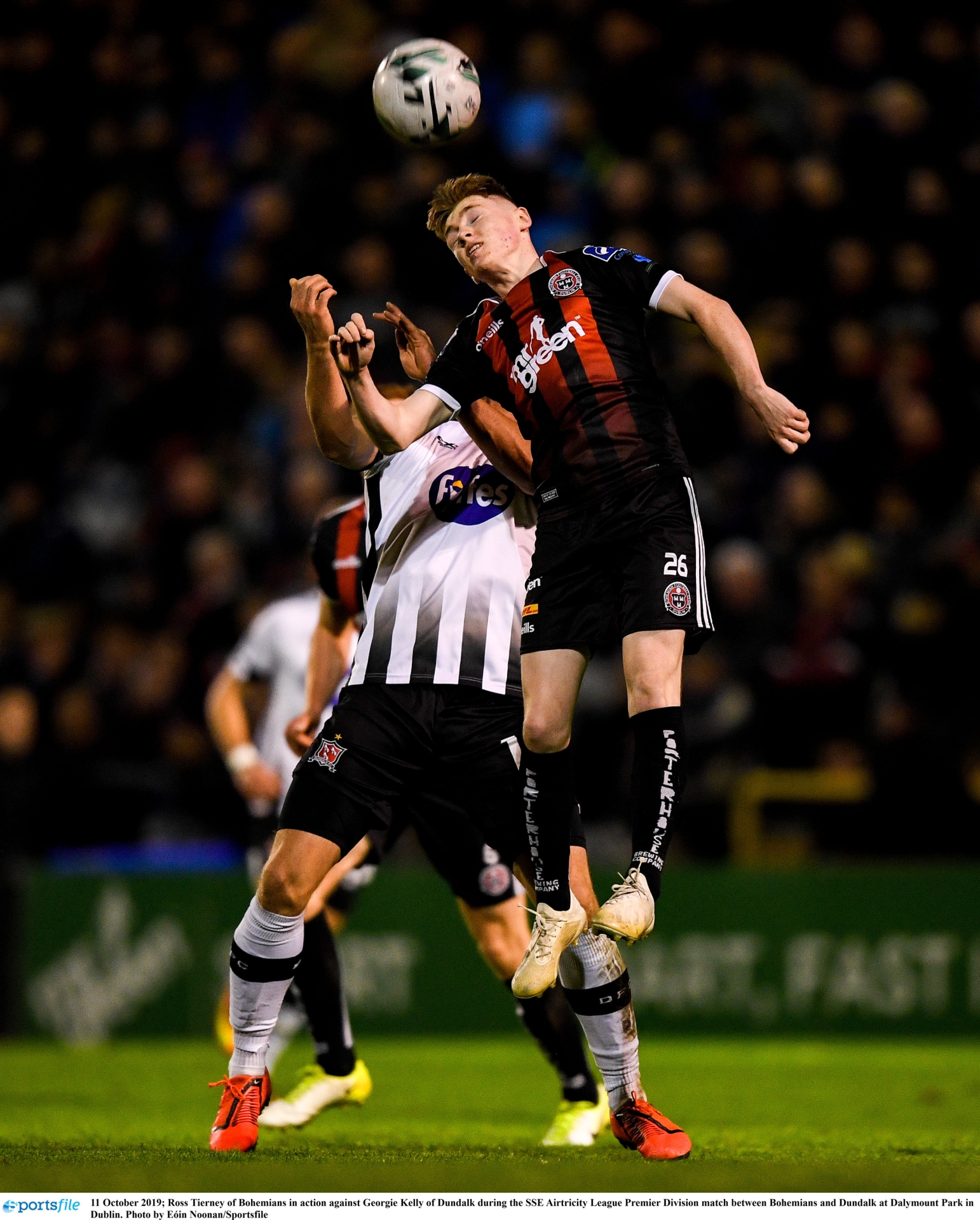 Dundalk FC's Georgie Kelly and Robert Cornwall of Bohemians during tonight's SSE Airtricity League Premier Division clash at Dalymount Park. (Pic: Sportsfile)