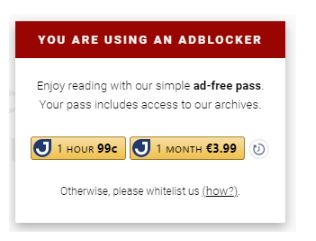 If you do not wish to whitelist our website, then you can purchase an ad block pass to access the content you wish to read. A pass may be purchased for the duration you want, from an hour to a month. You will be asked to set up a Jamatto account when you search for this content and see a popup similar to this: