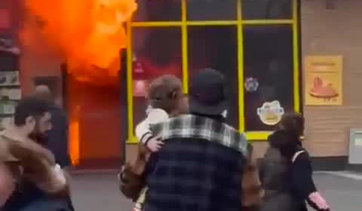 The flames can be seen bursting out the door of the Pizza Max premises with people in the vicinity fleeing for safety.